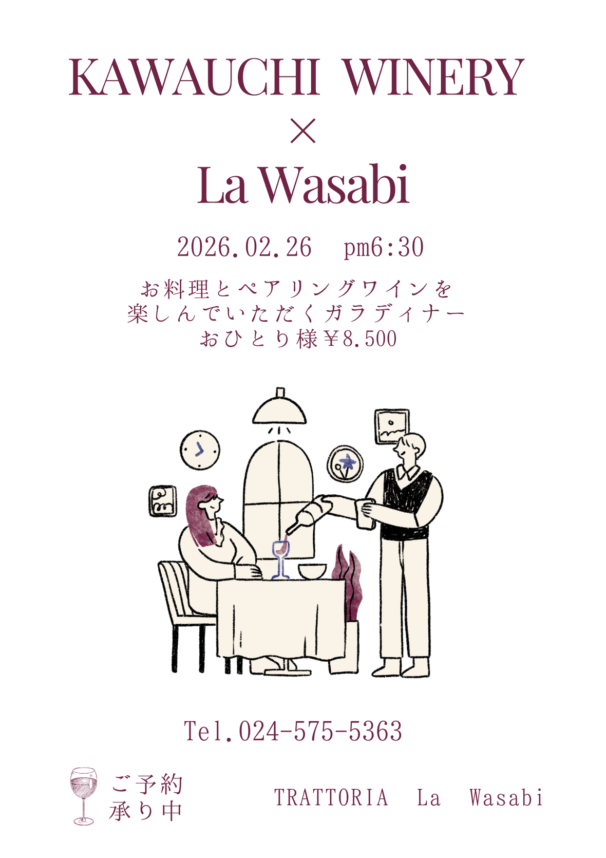 昨秋のワインヴァンヴィーノでコラボさせていただいたKAWAUCHI WINERYのマネージャー遠藤さんをお迎えして、当店の料理とペアリングワインを楽しんでいただくガラディナーを開催します。