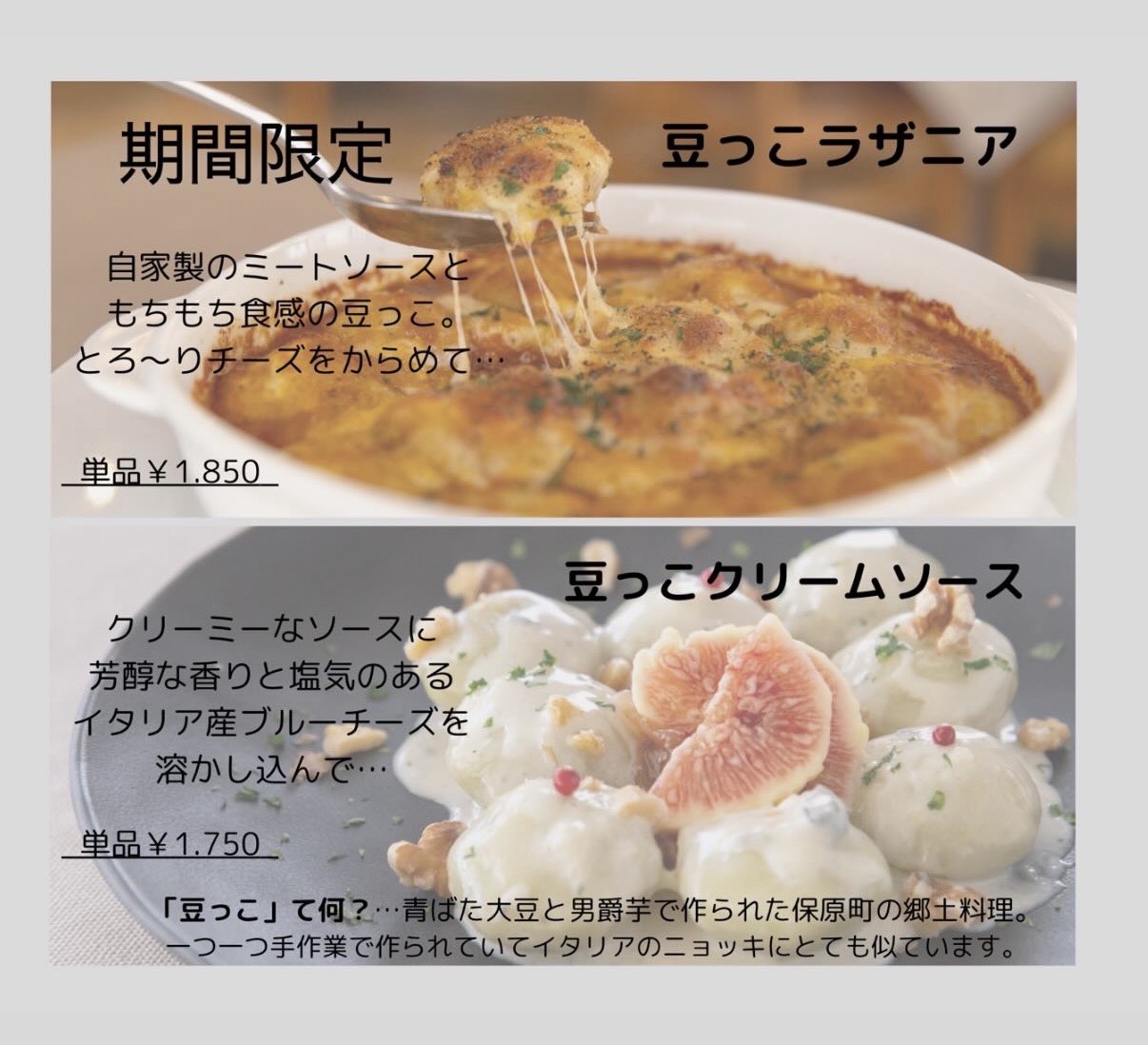 2026年01月17日(土) 期間限定!豆っこコラボ再開✨ 本日のディナーより、保原町のソウルフード【 豆っこ 】コラボ期間限定で再開しました! ラザニア風&ゴルゴンゾーラのクリームソースの2種✨ ランチ・ディナーともに提供可能です!