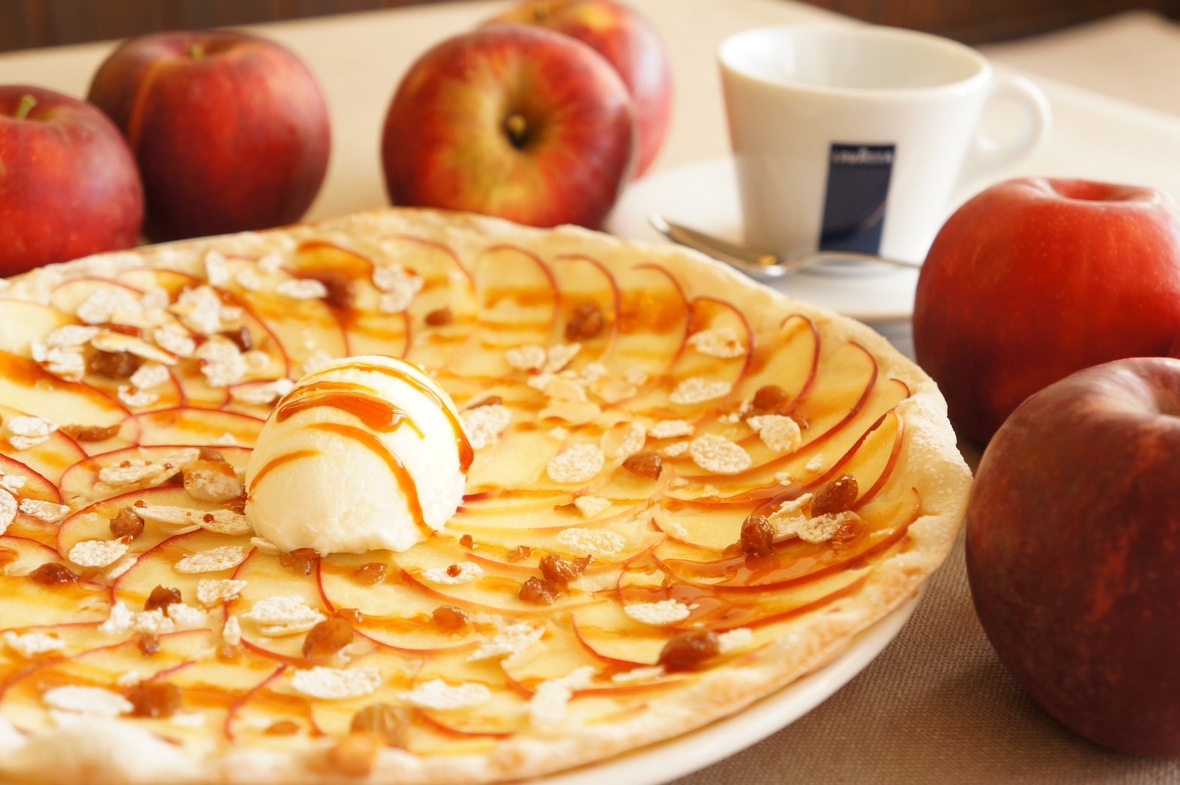 2023年11月18日(土) メニュー 地産林檎とクリームチーズのドルチェピッツァ! 地産林檎とクリームチーズのピッツァドルチェ 牛乳のジェラート添え… ほろ苦いキャラメルソースを逢わせて… ピッコロ ¥1,100 グランデ ¥1,680 甘酸っぱい自家製紅玉林檎のジャムとフレッシュ感を残した爽やかな酸味のサンふじ林檎を相性の良いクリームチーズと合わせて焼き上げました。ほろ苦いキャラメルソースをアクセントにミルキーなジェラートと共にお召し上がり下さい。