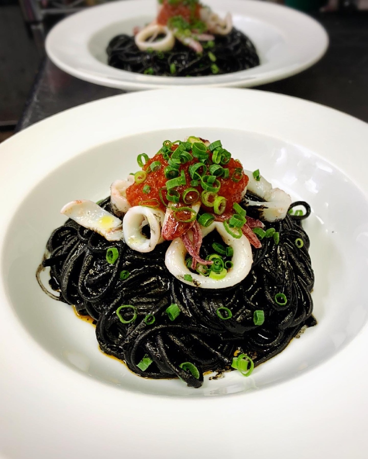 2023年06月01日(木) お知らせ 季節のおすすめパスタ 人気のイカ墨とジェノヴェーゼ始まりました! 今回のイカ墨ソースは夏の鯣イカを使い軽やかに・・・ジェノヴェーゼは松の実とペコリーノチーズで香り豊かに仕上げました。 冷えた白ワインと共にお楽しみください。 *ソテーした鯣烏賊とイカ墨のヴェネツィア風 バベッティーネ トマトフォンデュを添えて… ¥1700(税込) *新ジャガと旬インゲンのジェノヴァ風 リングイーネ ペコリーノチーズをからめて… ¥1700(税込)