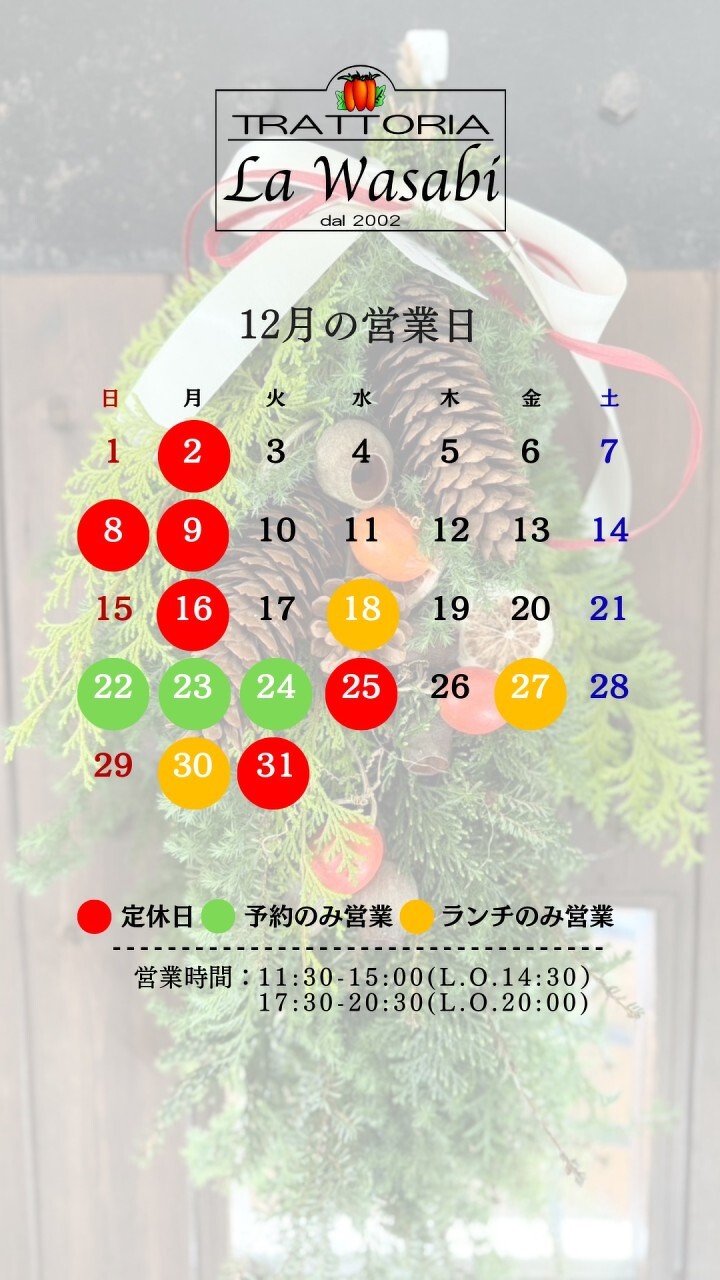 2024年11月15日(金) お知らせ 年末年始の営業について 30日(月)ランチ通常営業 / ディナー休み 31日(火)休み 1日(水)休み 2日(木)ランチ休み / ディナー通常営業 年末年始のお問い合わせも増えてまいりましたので、ご予定のお客様はお早めにお電話お願い致します。