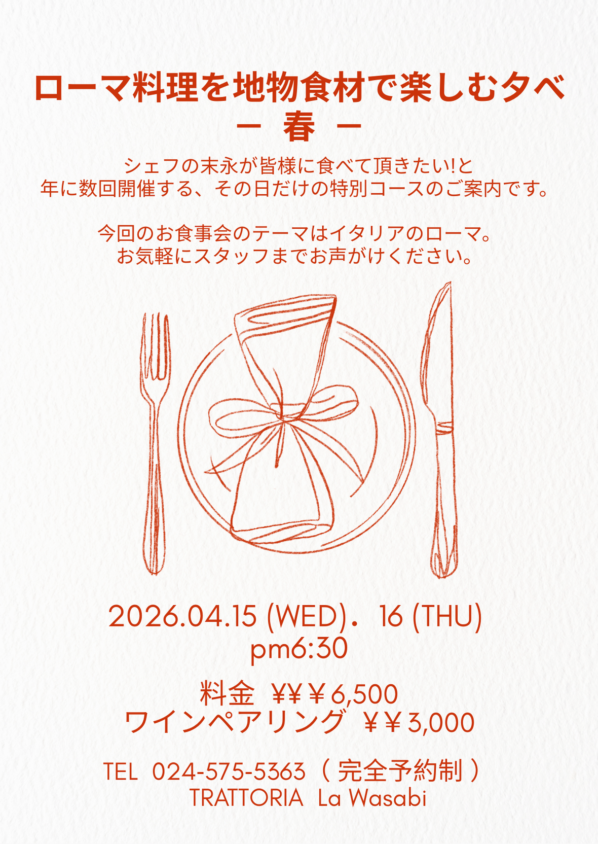 伝統的なローマの郷土料理を地物野菜と共に… Wasabiスタイルのフルコースでお楽しみください。